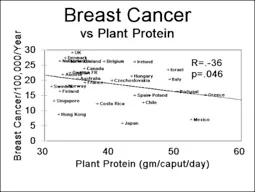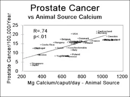 Surprisingly, multiple regression analysis of prostate cancer incidence (32) versus the same dietary and social variables showed the highest correlation with animal source calcium intake (R=.74, p<.01) (33), which in general means dairy products. Animal source Calories came in second and plant protein had the highest negative correlation coefficient (R= -.49, p=.0052). This finding is consistent with a cohort study of 20,316 men of various ethnicities interviewed between 1975 and 1980 in Hawaii (34) that found beef and milk consumption to increase risk for prostate cancer. Prostate cancer, once again, is a sex hormone dependent cancer (35). A more recent study again identified animal source fat as a risk factor for prostate cancer, particularly in blacks (36).