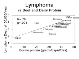 In 1977 Cunningham (24) examined the correlation between age-adjusted lymphoma mortality as reported by the WHO (25), and food intake as reported by the O.E.C.D. (26). Using multiple regression analysis for the intake of cereal grain, eggs, fish, nuts, pork, potatoes, poultry, pulses, seeds, starches, animal protein, crop protein, and total protein, he found the highest positive correlation with beef and dairy protein intake (R=.78, p<.001). Fish and all of the plant foods had a slight negative correlation.