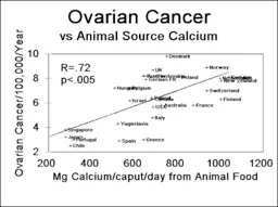 Ovarian cancer also appears related to animal food consumption (28). Animal source Calorie intake showed the highest positive correlation (R=.81, p<.007). Plant source Calories were protective, with an R value of -.62 and p<.005. Animal source calcium intake was also a risk, with an R value of .72, p=.0005.